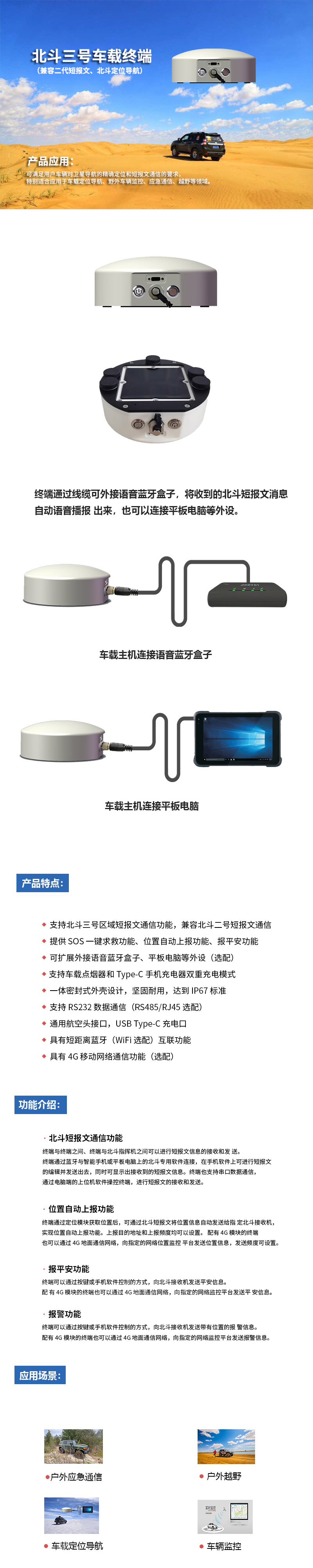 北斗三代车载终端可加装4G通信模块,支持4G全网通位置追踪功能。终端通过线缆外接语音蓝牙盒子、平板电脑等外设。终端采用防水防尘外壳,提供标准航空数据接口和Type-C充电口,可靠性高,磁吸或法兰盘安装,可满足用户车辆对卫星导航的精确定位和短报文通信的要求,特别适合应用于车载定位导航、野外车辆监控、应急通信、越野等领域。